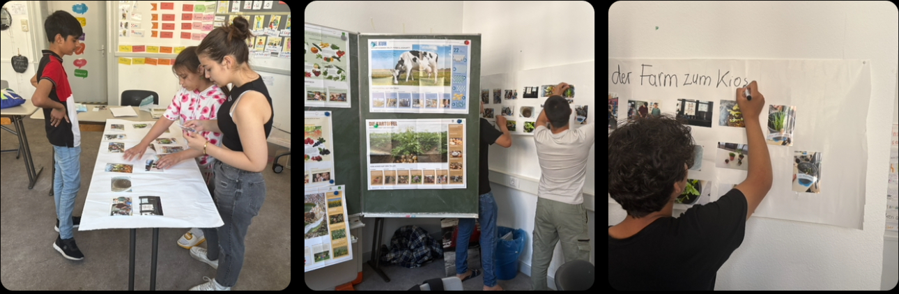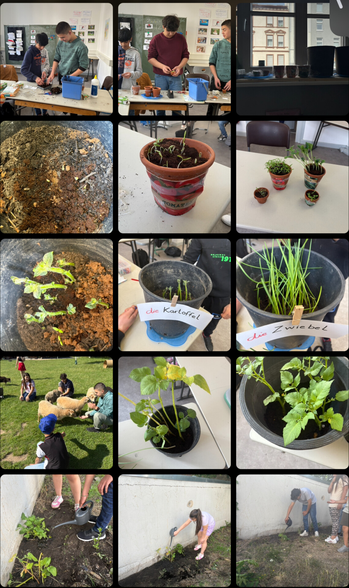 Im Rahmen der kreativen Umsetzung haben die Schüler:innen Plakate gestaltet, auf denen sie mit Fotos die wichtigsten Stationen dokumentieren konnten – zum einen den Besuch auf der Kinderfarm Offenbach, zum anderen den Prozess der Bepflanzung: vom Einpflanzen der Kartoffeln, Tomaten, Zucchini & Co. bis hin zur Pflege und Beobachtung des Pflanzenwachstums.