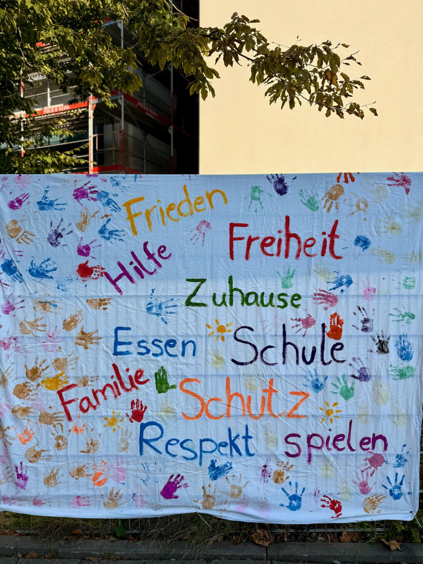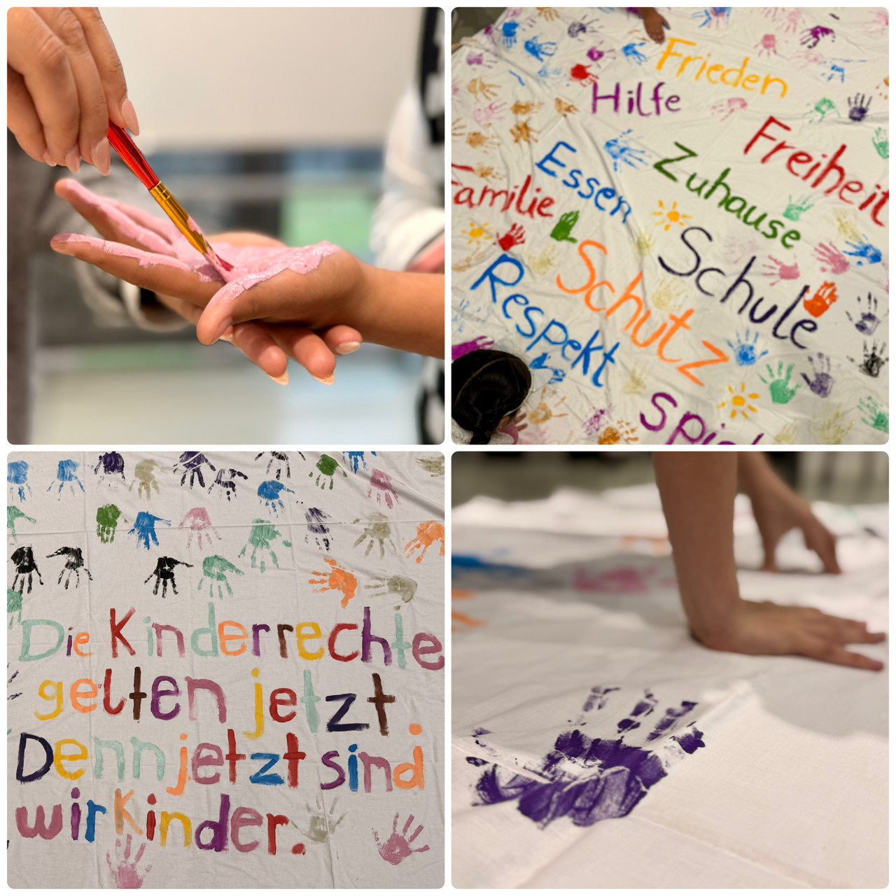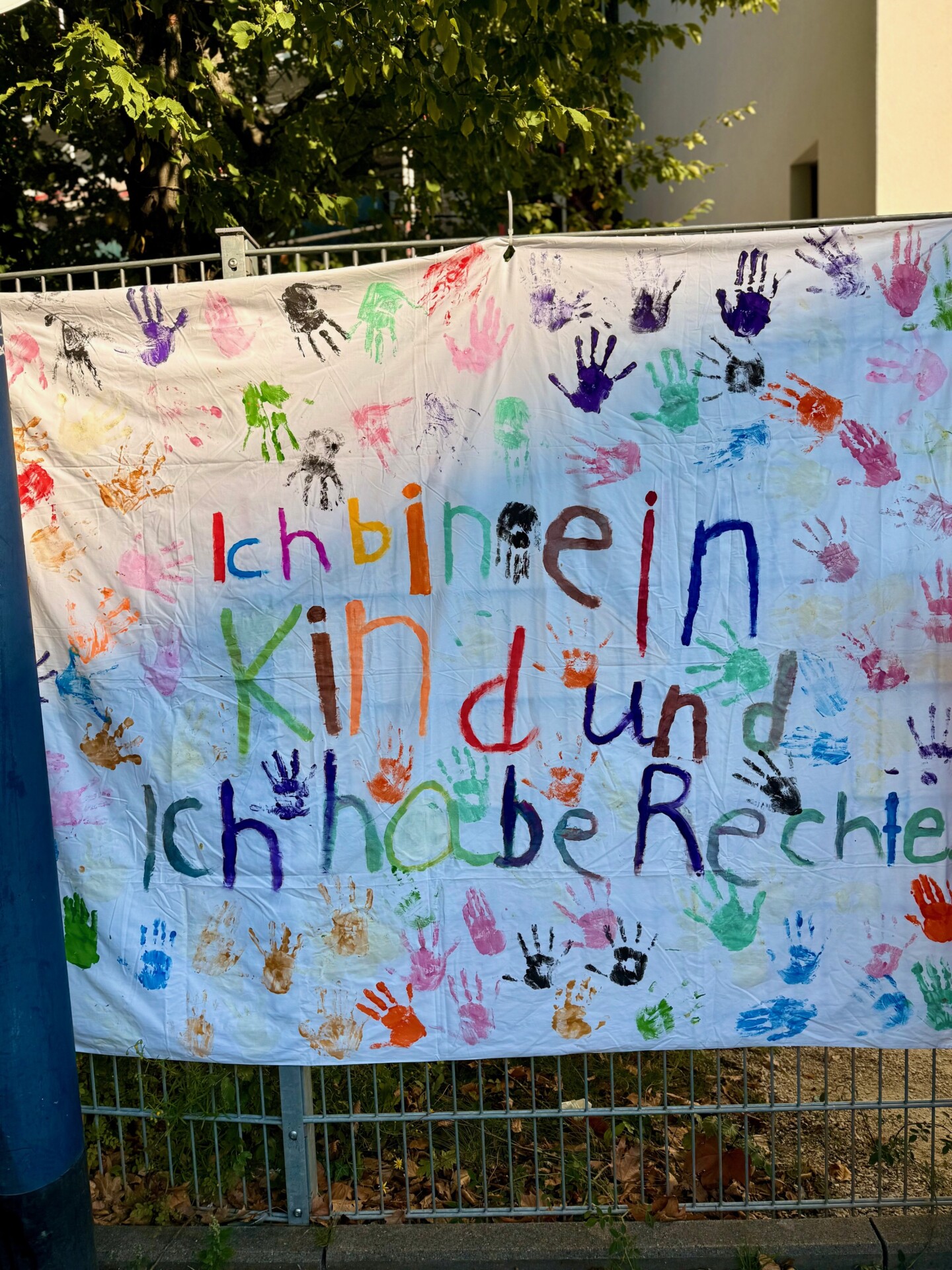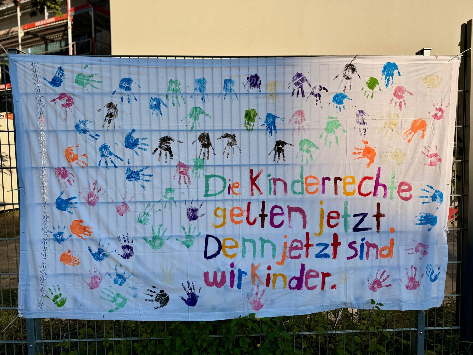 Am Samstag, den 20.9.25 wurde weltweit der WELTKINDERTAG gefeiert und diesen Anlass wollten wir uns nicht entgehen lassen. Insbesondere, da es rund um das wichtige Thema KINDERRECHTE ging. So feierten wir mit allen Klassen der Grundschule am 25.9.25 den Tag der Kinder und lernten gemeinsam rund um das Thema Kinderrechte. Im Mathildenforum las Frau Sonntag aus dem Buch ‚Ich bin ein Kind und ich habe Rechte‘ vor. Die Kinder waren sichtlich beeindruckt vom Bilderbuchkino und verewigten sich anschließend neben den wichtigsten Parolen des Buches per Handabdruck. Entstanden sind wunderschöne Bettlaken mit wichtigen Botschaften, die wir in die Welt hinaus tragen wollen. So hängen die Bettlaken seit dem 29.9.25 gut sichtbar für alle an den Außenmauern der Schule.