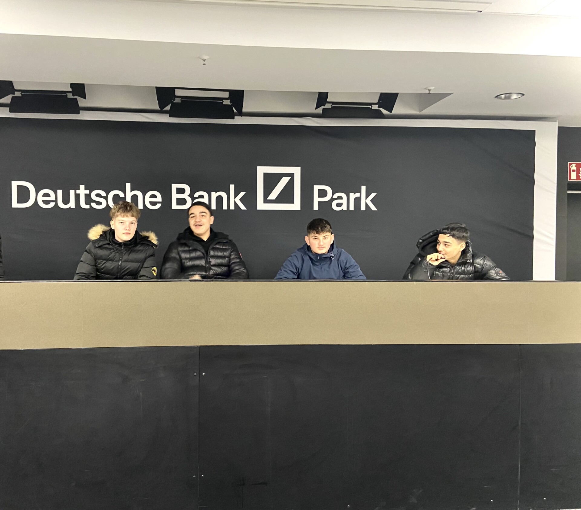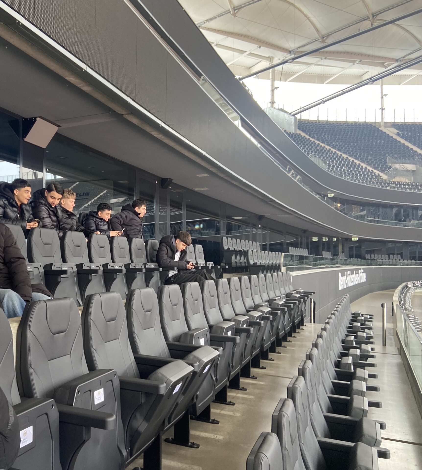 Nach dem Workshop ging es ins Stadion, wo die Klasse 8T hautnah erleben konnte, wo die Spieler von Eintracht Frankfurt trainieren und spielen. Die Schülerinnen und Schüler durften die Spieler-Kabinen betreten, auf den Plätzen der Profis sitzen und den Rasen aus nächster Nähe bewundern – inklusive einer spannenden Erklärung, wie er auch bei kalten Temperaturen gepflegt und beleuchtet wird. Besonders eindrucksvoll war der VIP-Bereich, von dem aus der Blick auf das Spielfeld fantastisch war.